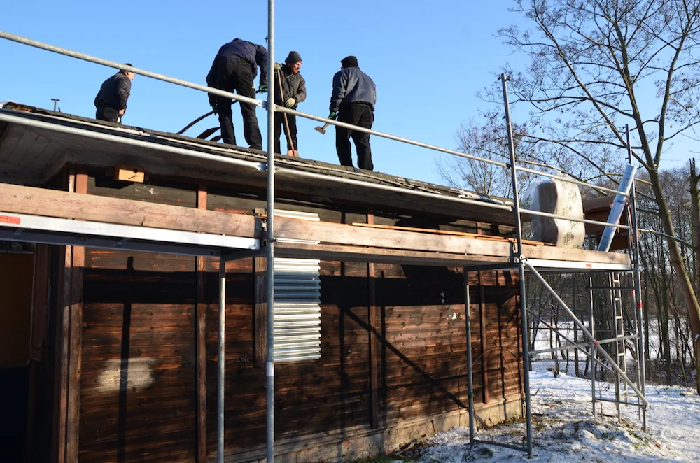 In January 2017, builders started work on Phase 1 Emergency Repairs for the Lake House. Carpenters will replace the roof and gutters, secure the house from the elements and remove an addition and wall added to the house in the 1960s. This work is being supervised by Denkmal architect, Andreas Pothoff, in collaboration with the Denkmal authority of the city of Potsdam.